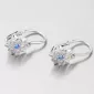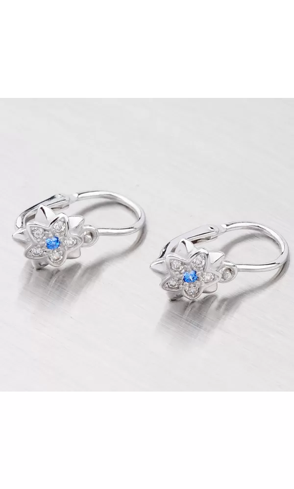 Náušničky v tvare kvietku, sú vyrobené z bieleho štrnásťkarátového zlata 585/1000 v lesklej povrchovej úprave s piatimi bielymi zirkónmi a jedným modrým zirkónom uprostred.