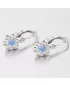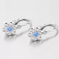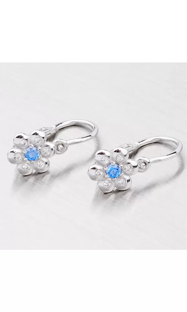 Detské náušničky v tvare kvietky, sú vyrobené z bieleho štrnásťkarátového zlata 585/1000 v lesklej povrchovej úprave so šiestimi bielymi zirkónmi vsadených do zlatých kvietkov, ktoré sú okolo modrého zirkónu.