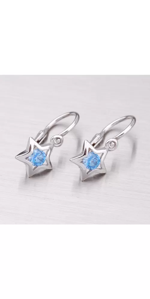 Detské náušničky - hviezdičky sú vyrobené z bieleho štrnásťtikarátového zlata 585/1000 v lesklej povrchovej úprave s jedným modrým zirkónom so zapínaním na brizúry.