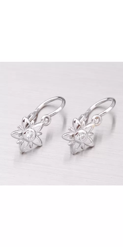 Detské náušničky v tvare kvietkov sú vyrobené z bieleho štrnásťkarátového zlata 585/1000 v lesklej povrchovej úprave s jedným bielym zirkónom. Náušničky sa zapínajú na detské zapínanie - brizúry.