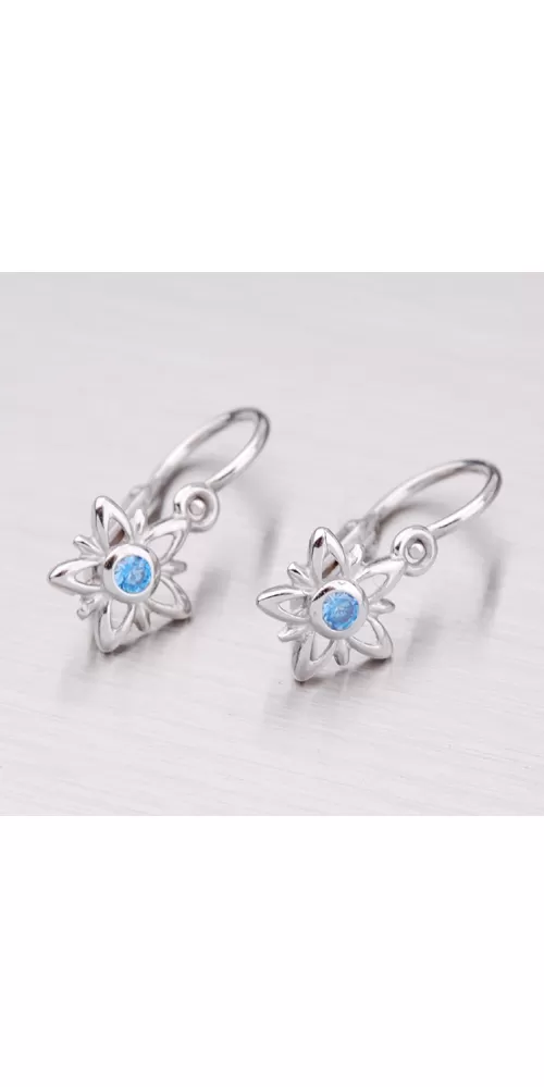 Detské náušničky v tvare kvietkov sú vyrobené z bieleho štrnásťkarátového zlata 585/1000 v lesklej povrchovej úprave s jedným modrým zirkónom. Náušničky sa zapínajú na detské zapínanie - brizúry.