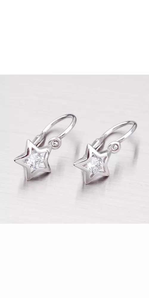 Detské náušničky - hviezdičky sú vyrobené z bieleho štrnásťtikarátového zlata 585/1000 v lesklej povrchovej úprave s jedným bielym zirkónom so zapínaním na brizúry.
