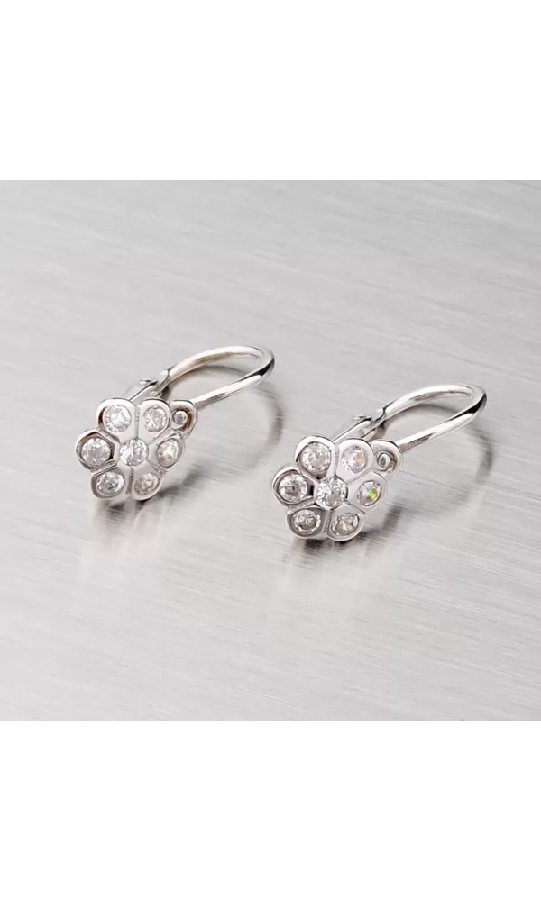Detské náušnice v tvare kvietky vyrobené z bieleho štrnástikarátového zlata 585/1000 v lesklej povrchovej úprave s bielymi zirkónmi so zapínaním na brizúry.