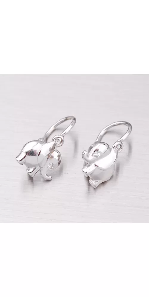 Detské náušnice v tvare sloníkov sú vyrobené z bieleho štrnásťkarátového zlata 585/1000 v kombinácii lesklej a matnej povrchovej úpravy s jedným zirkónom bielej farby. Náušničky sa zapínajú na brizúry.