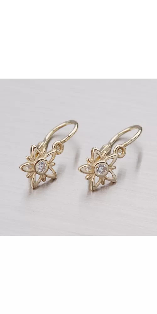Detské náušničky v tvare kvietkov sú vyrobené zo žltého štrnásťtikarátového zlata 585/1000 v lesklej povrchovej úprave s jedným bielym zirkónom. Náušničky sa zapínajú na detské zapínanie - brizúry.