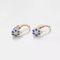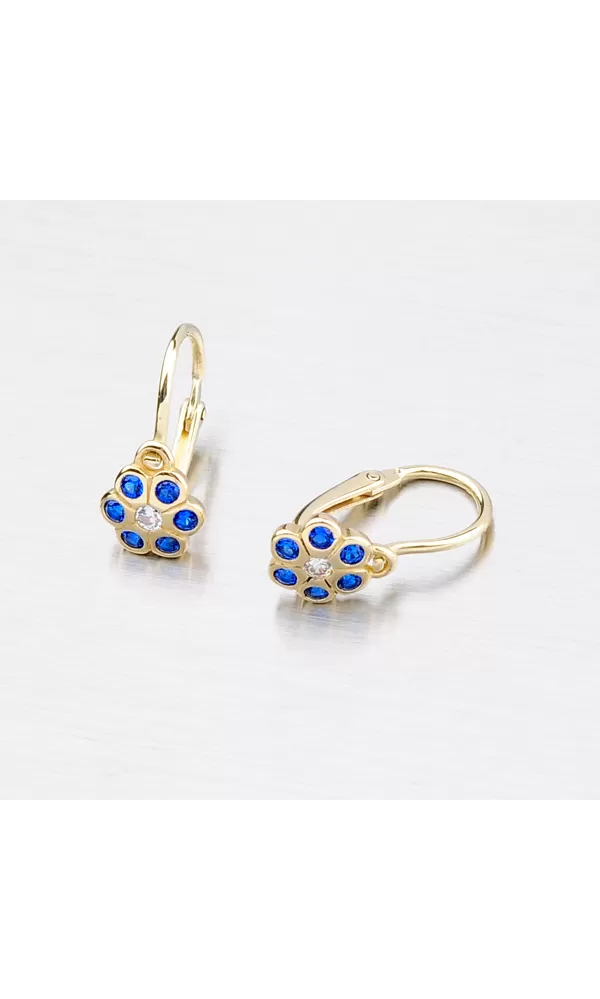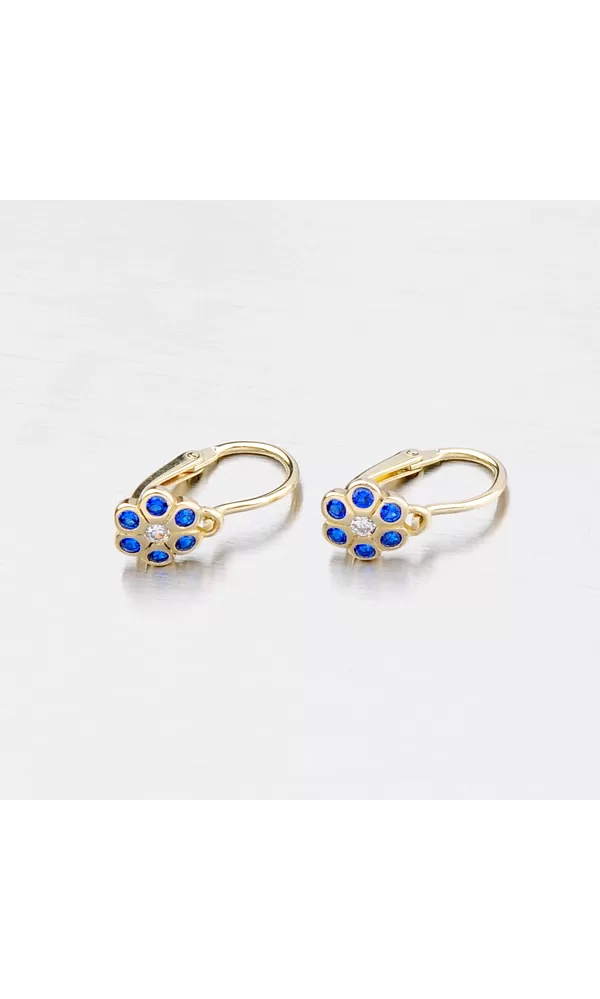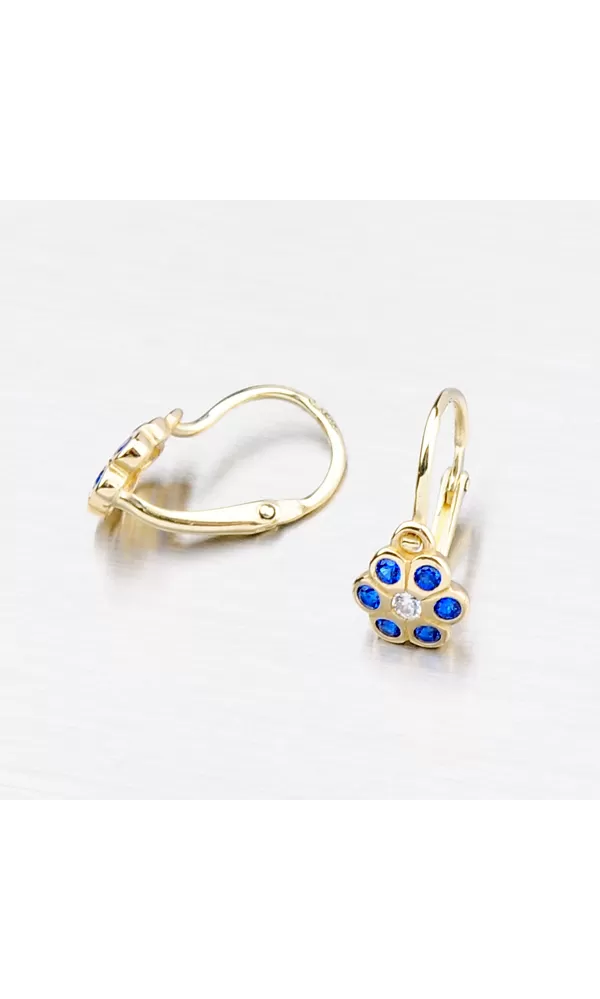 Detské náušnice v tvare kvietky so syntetickými modrými zafírmi sú vyrobené zo žltého štrnásťkarátového zlata s rýdzosťou 585/1000 v lesklej povrchovej úprave. Náušničky sa zapínajú na bezpečné detské brizúry a tak nehrozí ich pád a strata.