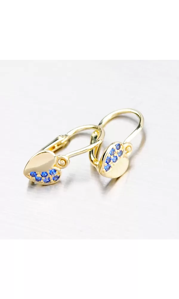 Detské náušnice v tvare srdiečka so syntetickými modrými zafírmi sú vyrobené zo žltého štrnásťkarátového zlata s rýdzosťou 585/1000 v lesklej povrchovej úprave. Náušničky sa zapínajú na bezpečné detské brizúry a tak nehrozí ich pád a strata.