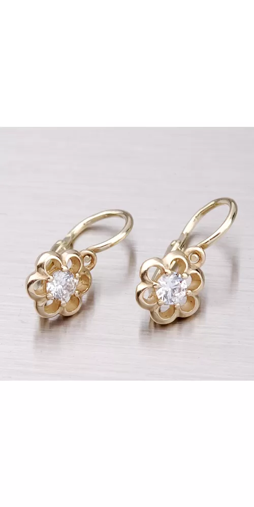 Detské náušnice v tvare kvietky sú vyrobené zo žltého štrnásťkarátového zlata 585/1000 v lesklej povrchovej úprave s jedným zirkónom bielej farby farby. Náušničky sa zapínajú na brizúry.
