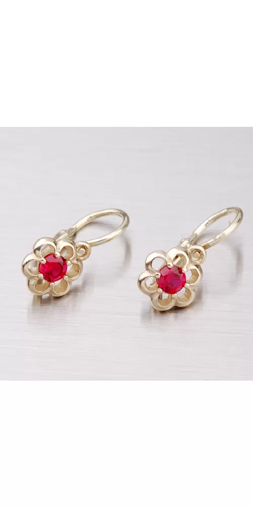 Detské náušnice v tvare kvietky sú vyrobené zo žltého štrnásťkarátového zlata 585/1000 v lesklej povrchovej úprave s jedným zirkónom červenej farby. Náušničky sa zapínajú na brizúry.