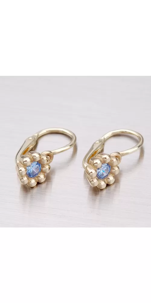Detské náušnice v tvare kvietky sú vyrobené zo žltého štrnásťkarátového zlata 585/1000 v lesklej povrchovej úprave s jedným zirkónom modrej farby.… Celý popis