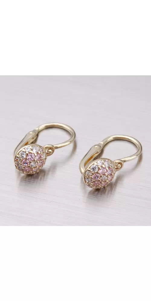 Detské náušnice sú vyrobené zo žltého štrnásťkarátového zlata 585/1000 v lesklej povrchovej úprave s drobnými bielymi a ružovými zirkónmi. Náušničky so zapínaním na brizúry.