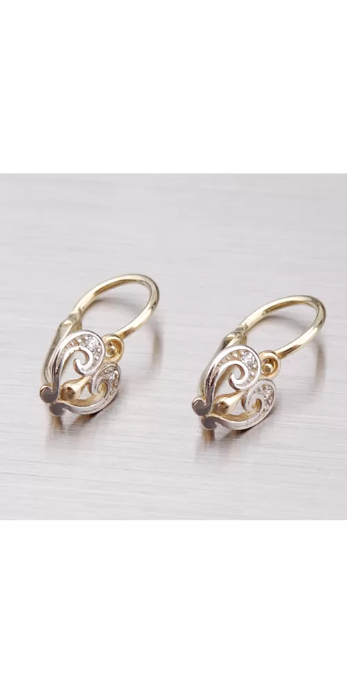 Srdiečka - detské náušnice sú vyrobené v kombinácii zo žltého a bieleho štrnásťtikarátového zlata 585/1000 v lesklej povrchovej úprave s jedným zirkónom bielej farby. Náušničky sa zapínajú na brizúry.
