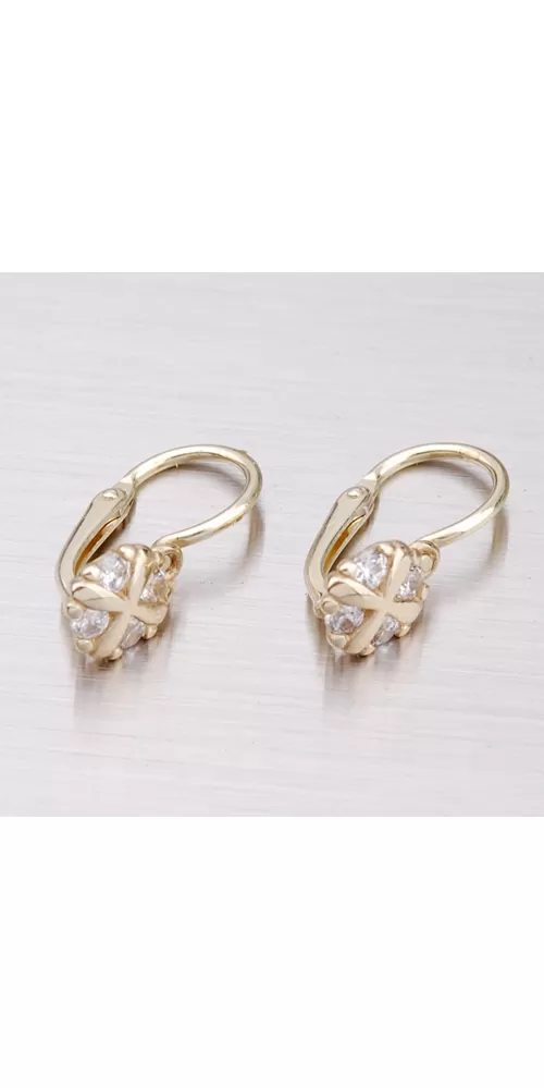 Detské náušnice v tvare kvietku sú vyrobené zo žltého štrnásťkarátového zlata 585/1000 v lesklej povrchovej úprave so štyrmi bielymi zirkónmi so zapínaním na brizúry.