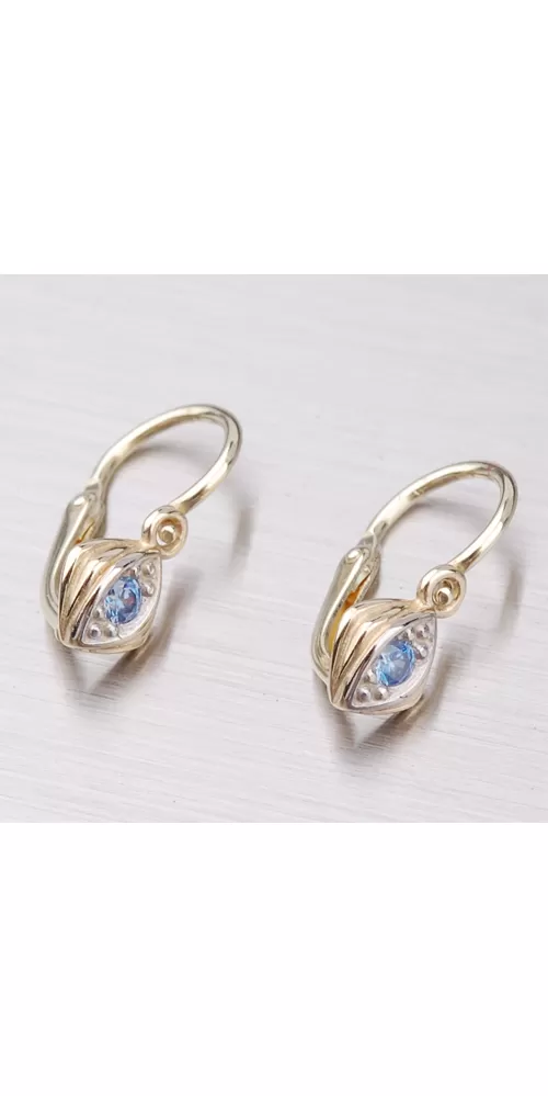 Detské náušnice sú vyrobené v kombinácii zo žltého a bieleho štrnásťtikarátového zlata 585/1000 v lesklej povrchovej úprave s jedným zirkónom modrej farby. Náušničky sa zapínajú na brizúry.