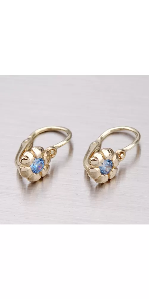 Detské náušnice v tvare kvietky sú vyrobené zo žltého štrnásťkarátového zlata 585/1000 v lesklej povrchovej úprave s jedným zirkónom modrej farby. Náušničky sa zapínajú na brizúry.