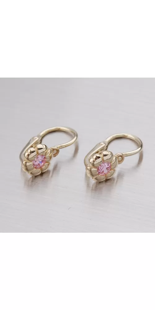 Detské náušnice v tvare kvietky sú vyrobené zo žltého štrnásťkarátového zlata 585/1000 v lesklej povrchovej úprave s jedným zirkónom ružovej farby. Náušničky sa zapínajú na brizúry.