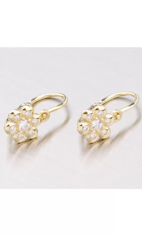 Detské náušničky v tvare kvietky, sú vyrobené zo žltého štrnásťkarátového zlata 585/1000 v lesklej povrchovej úprave so šiestimi bielymi zirkónmi vsadených do zlatých kvietkov, ktoré sú okolo bieleho zirkónu