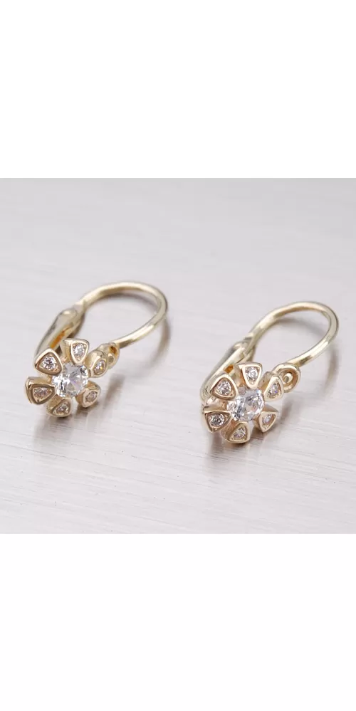 Detské náušnice v tvare kvietky vyrobené zo žltého štrnásťtikarátového zlata 585/1000 v lesklej povrchovej úprave so šiestimi drobnými a jedným väčším zirkónom bielej farby. Náušničky sa zapínajú na brizúry.