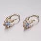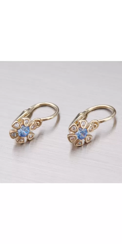 Detské náušnice v tvare kvietky vyrobené zo žltého štrnástikarátového zlata 585/1000 v lesklej povrchovej úprave so šiestimi drobnými zirkónmi bielej farby a jedným väčším zirkónom modrej farby.