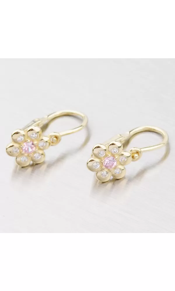 Detské náušničky v tvare kvietky, sú vyrobené zo žltého štrnásťkarátového zlata 585/1000 v lesklej povrchovej úprave so šiestimi bielymi zirkónmi vsadených do zlatých kvietkov, ktoré sú okolo ružového zirkónu.