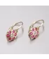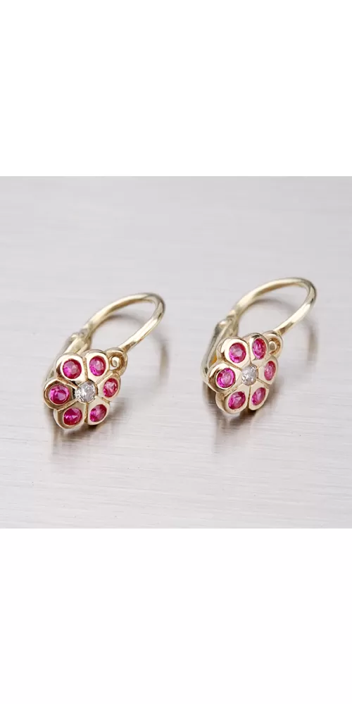 Detské náušnice v tvare kvietky vyrobené zo žltého štrnástich karátového zlata v lesklej povrchovej úprave so šiestimi červenými a jedným bielym zirkónom so zapínaním na brizúry.