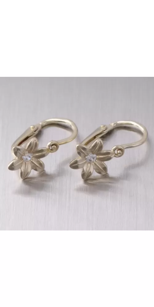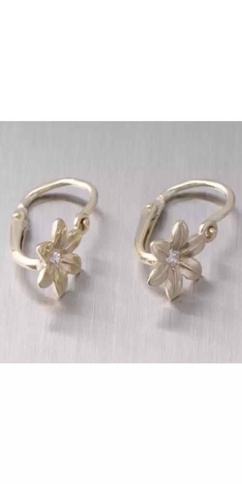 Detské náušnice v tvare kvietky vyrobené zo žltého štrnástich karátového zlata v lesklej povrchovej úprave s jedným bielym zirkónom so zapínaním na brizúry.