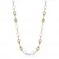 Tento náhrdelník je vyrobený z chirurgickej ocele so zlatým povrchom PVD, ktorý mu dodáva teplý odtieň zlata a zaisťuje odolnosť proti opotrebeniu. Dizajn náhrdelníka je zdobený perlami s bielym slzou, ktoré vytvárajú jemný a ženský kontrast k zlatému kovu. Upevnenie je vyriešené jednoduchou, ale spoľahlivou karabínou. Celkovo tento model vyzerá ako vkusný doplnok vhodný pre každý deň a pre sviatočné príležitosti.
