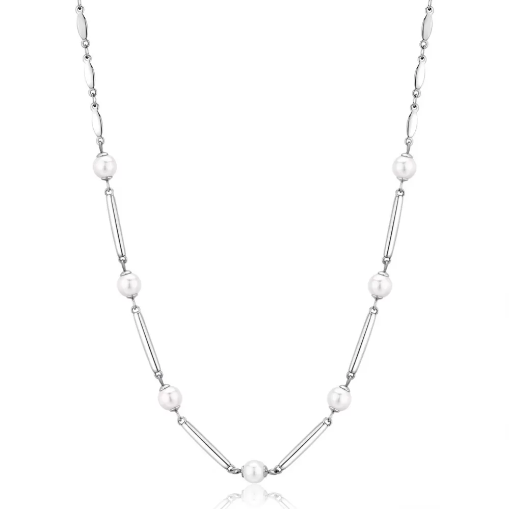 Nežný náhrdelník dokonale ozdobí každú ženu. Náhrdelník je vyrobený z vysoko kvalitnej nerezovej ocele v lesklej povrchovej úprave. Šperk je zdobený syntetickými perlami v bielej farbe a skvele dopĺňajú celý dizajn náhrdelníka.