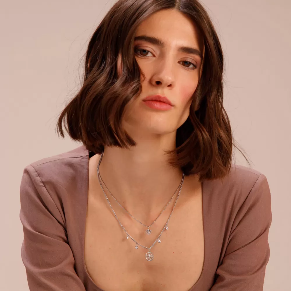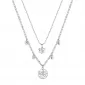 Moderný, dvojradový náhrdelník je vyrobený z vysoko kvalitnej nerezovej ocele v lesklej povrchovej úprave. Náhrdelník je zdobený príveskami, ktoré vyobrazujú lotosový kvet. Trblietanie dodávajú náhrdelníku precízne brúsené Swarovski kryštály.