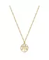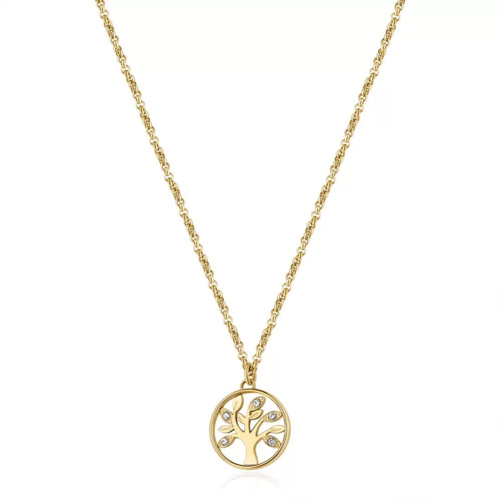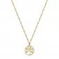 Dámsky náhrdelník je vyrobený z vysoko kvalitnej nerezovej ocele, ktorá je ošetrená PVD povrchovou úpravou vo farbe žltého zlata. Náhrdelník je zložený z pevnej retiazky a prívesku. Prívesok v okrúhlom tvare, zdobí strom života vysadený kryštálmi Swarovski. Ozdobte sa dokonalým šperkom.
