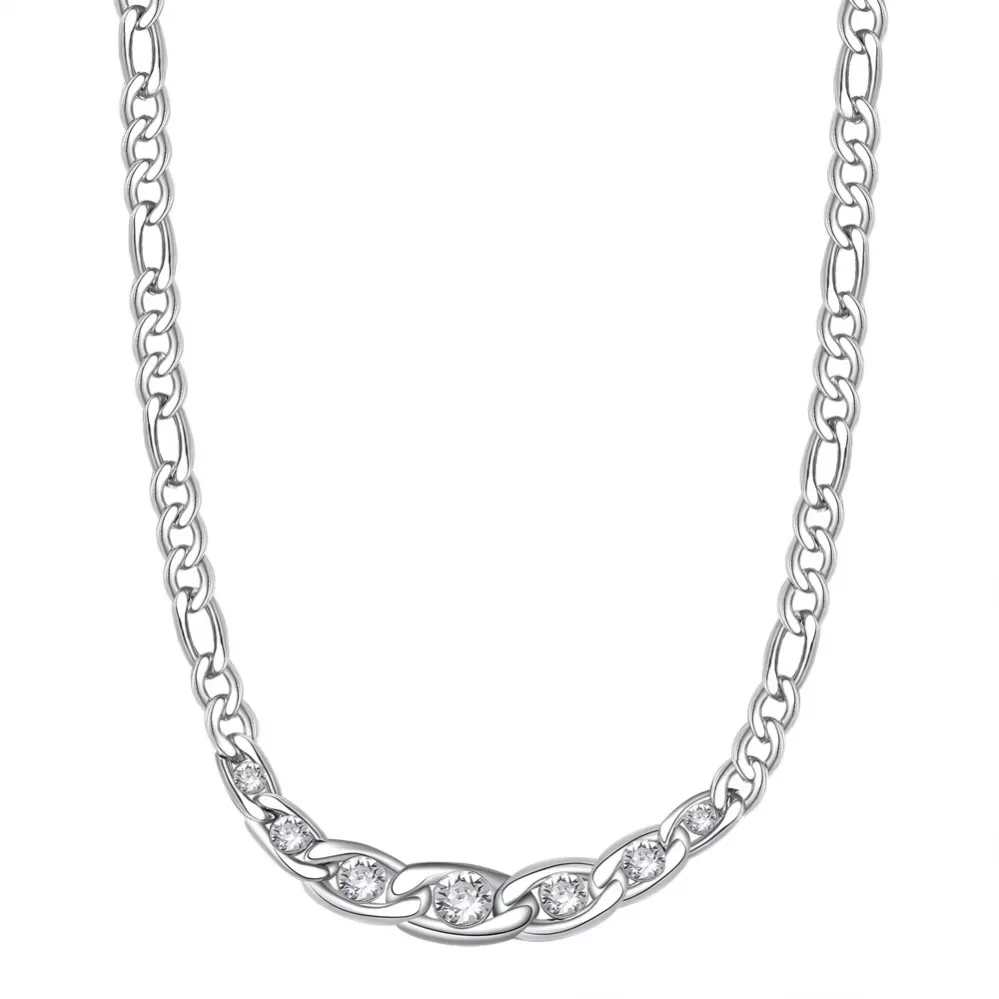 Masívny ale napriek tomu elegantný náhrdelník je určený pre odvážne ženy. Náhrdelník je v prevedení figaro 3+1 z vysoko kvalitnej ušľachtilej ocele v lesklej povrchovej úprave. Na podporenie Vašej ženskosti sú do náhrdelníka vsadené prvotriedne Swarovski kryštály.