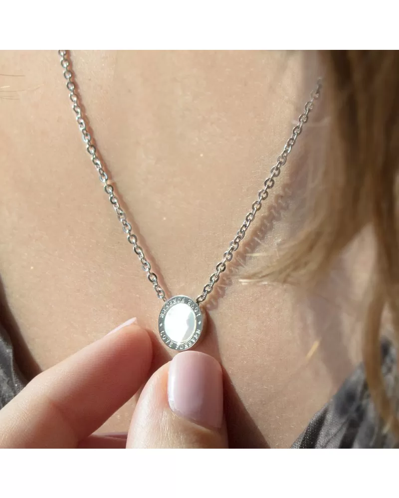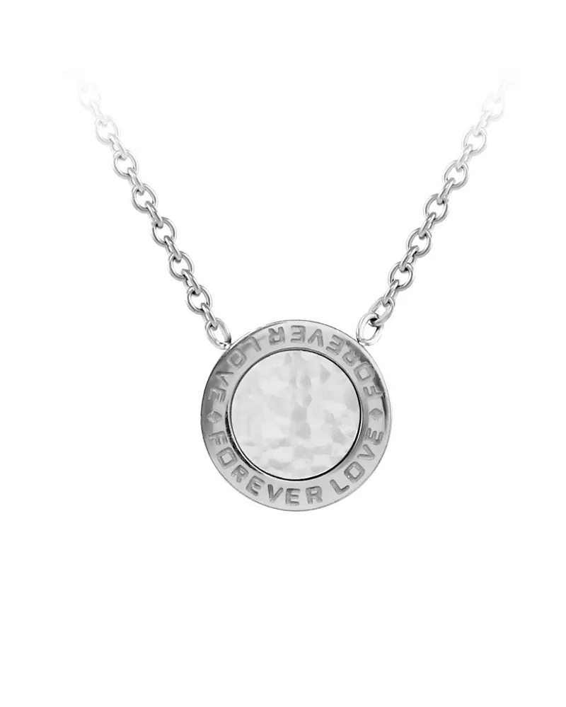 Ozdobte svoj dekolt náhrdelníkom z chirurgickej ocele. Náhrdelník je zdobený okrúhlym príveskom s nápisom LOVE Forever a perleťovou výplňou uprostred. Náhrdelník sa zapína na karabínu.