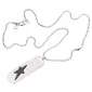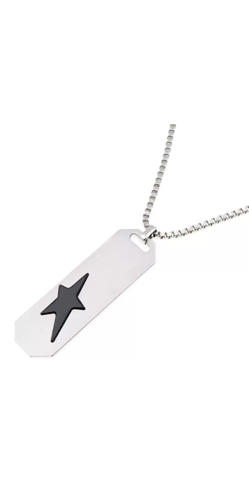 Značka Thierry Mugler sa vyznačuje osobitým a štýlovým prístupom k móde a tiež v oblasti vytvárania šperkov. Tento náhrdelník z chirurgickej ocele je tvorený z oceľovej doštičky, ktorá je zdobená klasickým znakom Thierry Mugler u ktorého je zrejmá súvzťažnosť s jedným z najpredávanejších parfémov na svete a to s Thierryho pýchou parfémom "Angel". Doštička je vyrobená vo farebnom oceľovej farby a čiernej hviezdy v kombinácii lesklej a matnej povrchovej úpravy. Náhrdelník je zavesený na retiazke typu Venecia. K náhrdelníku je pridaná 5cm retiazka, ktorá sa dá použiť buď na predĺženie retiazky alebo ako retiazka na zavesenie prívesku.
