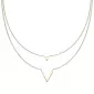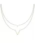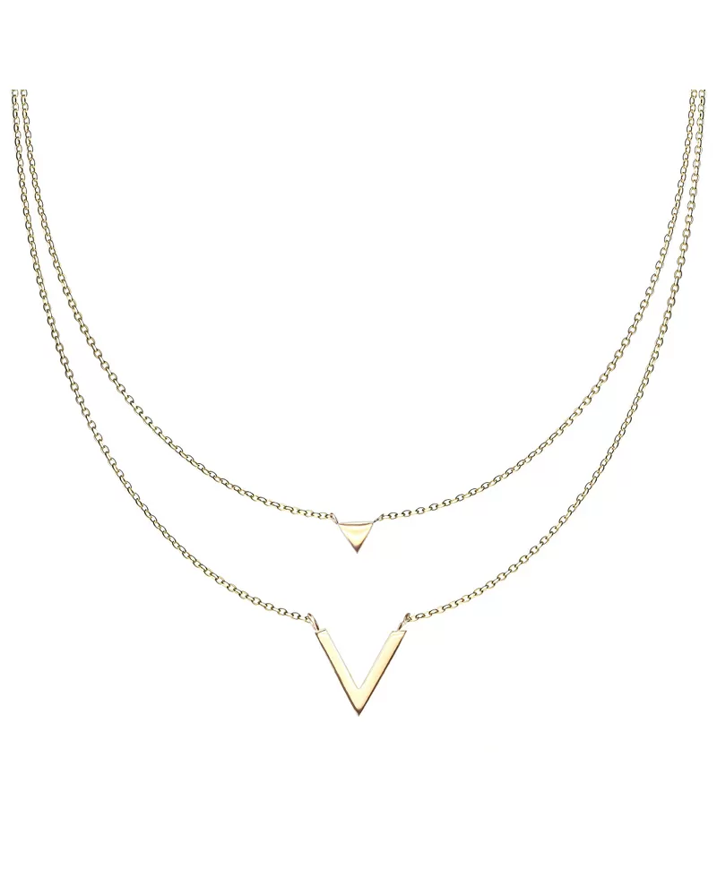 Ozdobte svoj dekolt veľmi efektným šperkom, ktorý sa len tak neopozerá. Náhrdelník je tvorený z dvoch retiazok anker, ktoré sa líšia dĺžkou. Kratšie z retiazky zdobí jemný trojuholník leštený do vysokého lesku. Dlhšiu retiazku zdobí prívesok v tvare písmenka v. Dĺžka náhrdelníka je 45 cm s použitím prídavnej retiazky 5 cm je možné náhrdelník zapnúť až na dĺžku 50 cm. Náhrdelník je vyrobený z chirurgickej ocele, ktorá je opatrená PVD povrchovou úpravou vo farbe žltého zlata. Prednosťou zlatenia technológií PVD je vysoká tvrdosť a odolnosť proti oteru! Ide o hrubú vrstvu, ktorá preniká do pôvodného materiálu. Zlatenie technológií PVD sa dá porovnať s približne 12 mikrónmi galvanického zlatenia, čo je vysoká hodnota, ktorá pri bežnom nosení vydrží až 12 rokov.