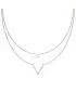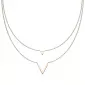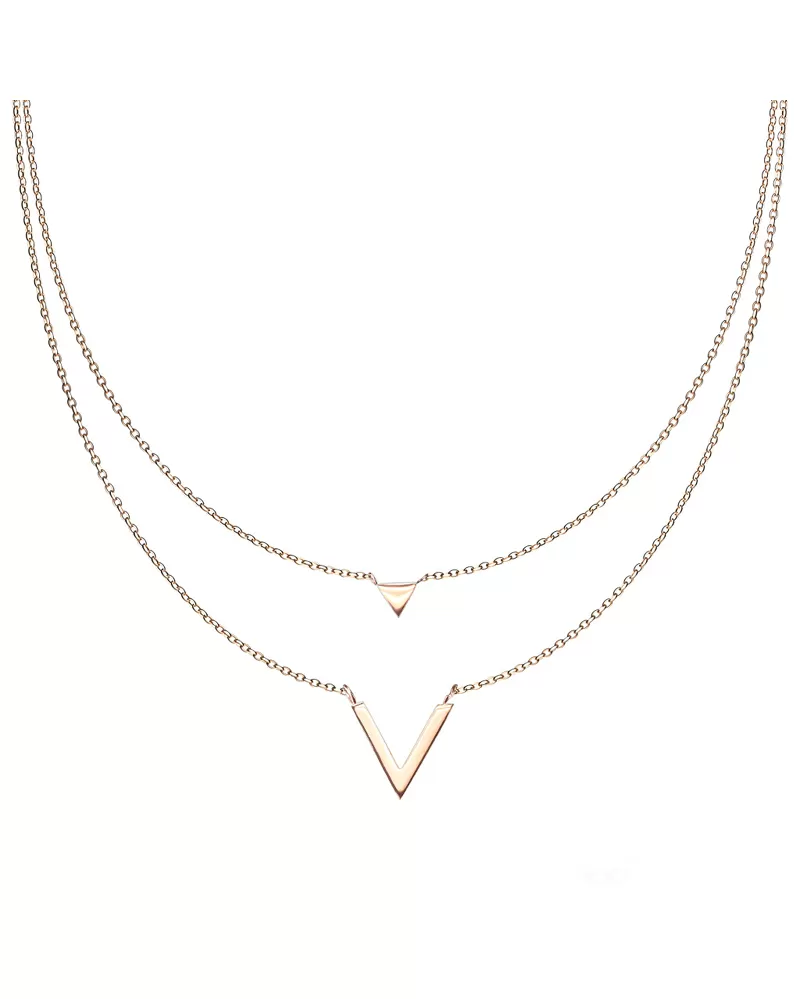 Ozdobte svoj dekolt veľmi efektným šperkom, ktorý sa len tak neopozerá. Náhrdelník je tvorený z dvoch retiazok anker, ktoré sa líšia dĺžkou. Kratšie z retiazok zdobí jemný trojuholník leštený do vysokého lesku. Dlhšiu retiazku zdobí prívesok v tvare písmenka V. Dĺžka náhrdelníka je 45 cm s použitím prídavnej retiazky 5 cm je možné náhrdelník zapnúť až na dĺžku 50 cm. Náhrdelník je vyrobený z chirurgickej ocele, ktorá je opatrená PVD povrchovou úpravou vo farbe ružového zlata. Prednosťou zlatenia technológií PVD je vysoká tvrdosť a odolnosť proti oteru! Ide o hrubú vrstvu, ktorá preniká do pôvodného materiálu. Zlatenie technológií PVD sa dá porovnať s približne 12 mikrónmi galvanického zlatenia, čo je vysoká hodnota, ktorá pri bežnom nosení vydrží až 12 rokov.
