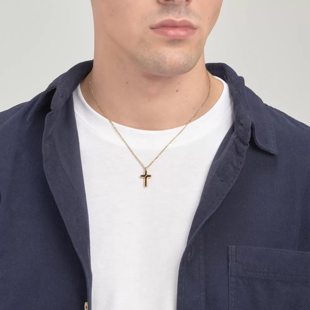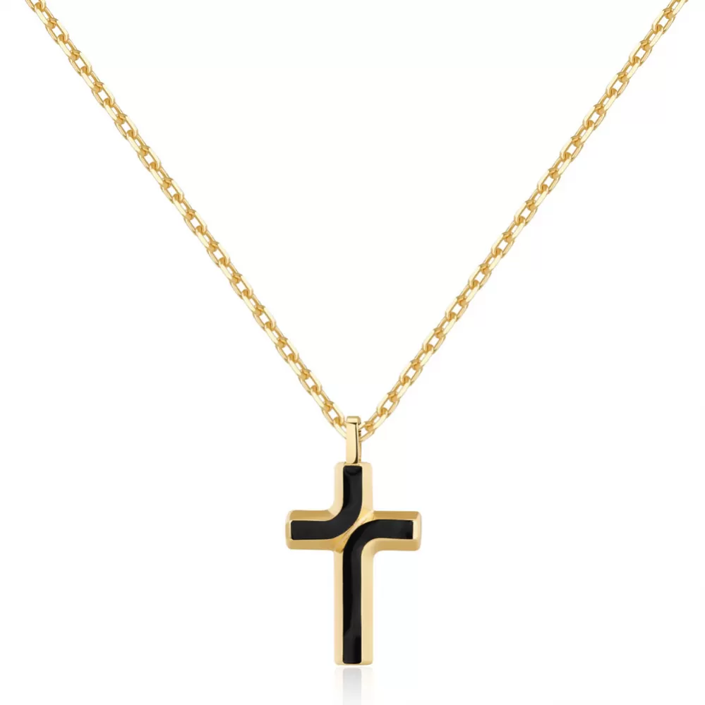 Pánsky náhrdelník je vyrobený z vysoko kvalitnej nerezovej ocele, ktorá je ošetrená PVD povrchovou úpravou vo farbe žltého zlata . Náhrdelník je zložený z pevnej retiazky a prívesku v tvare kríža.