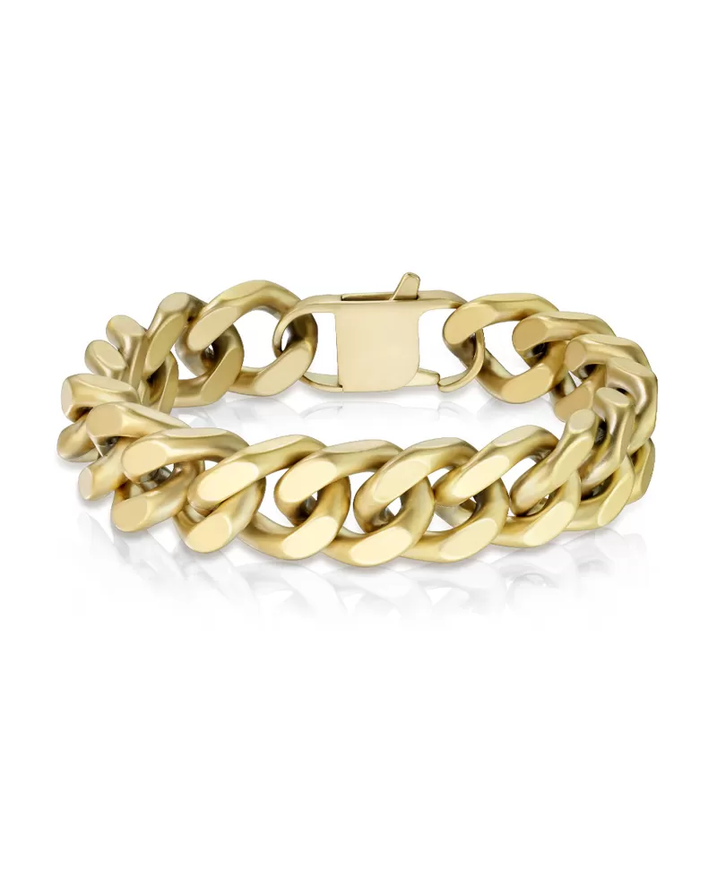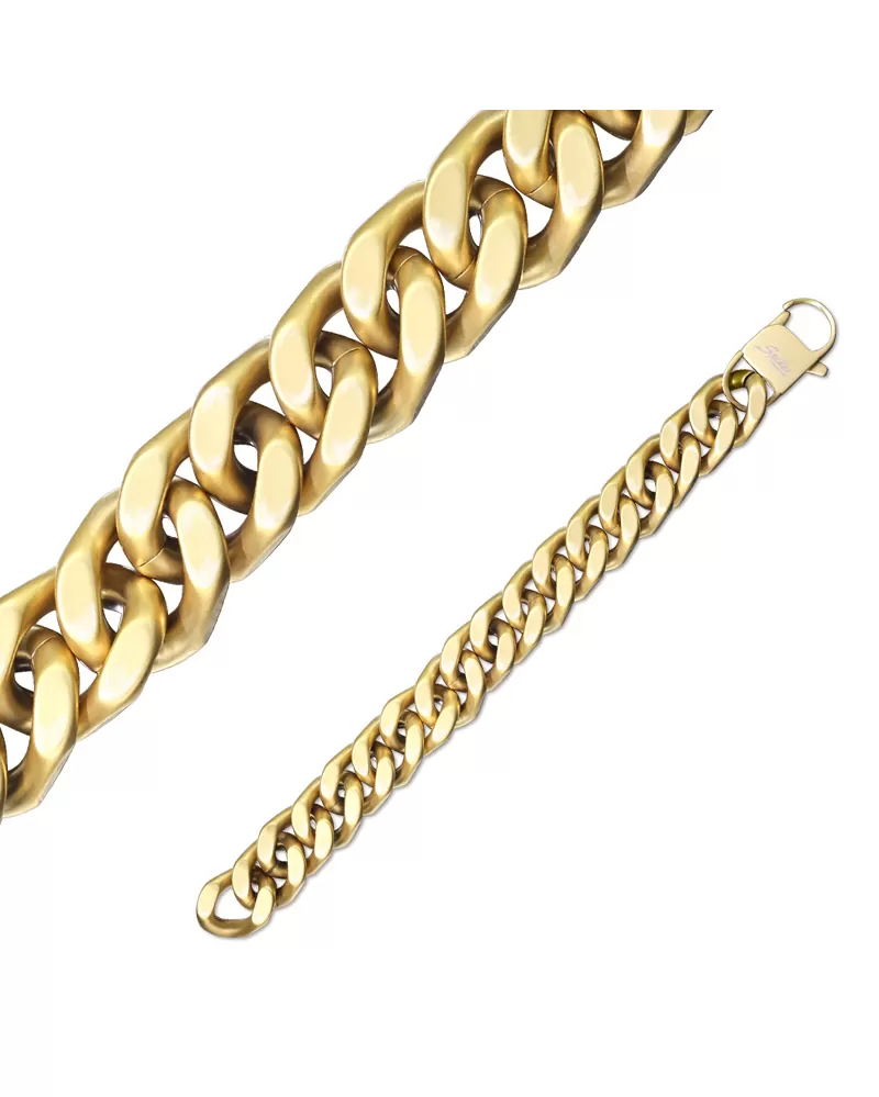 Masívny pánsky náramok  je vyrobený z chirurgickej ocele, ktorá je opatrená PVD povrchovou úpravou v žltej farbe zlata, v matnej povrchovej úprave Prednosťou zlatenia technológií PVD je vysoká tvrdosť a odolnosť proti oteru! , Ktorá preniká do pôvodného materiálu. mikróny galvanického zlatenia, čo je vysoká hodnota, ktorá pri bežnom nosení vydrží až niekoľko rokov.
