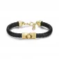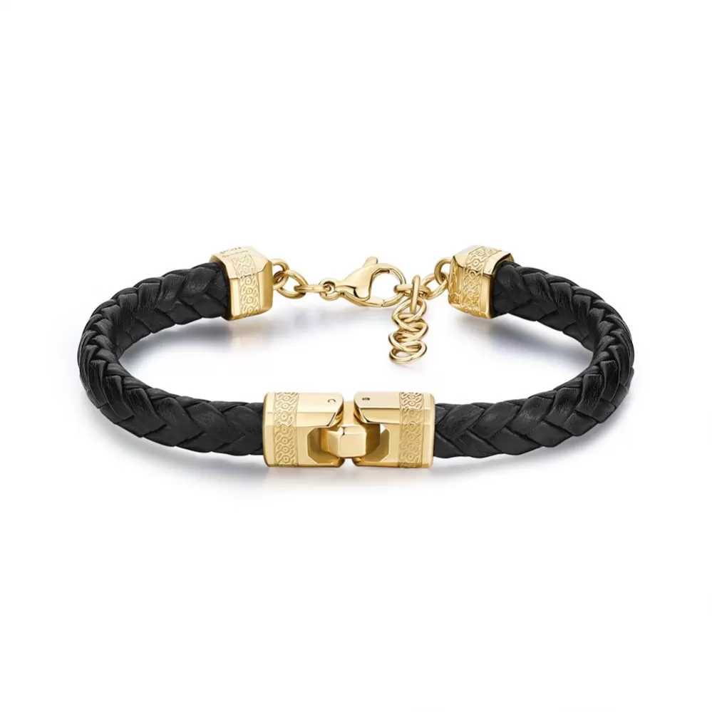 Elegantný pánsky náramok je vyrobený v kombinácii čiernej kože a vysoko kvalitnej nerezovej ocele. Oceľ je ošetrená PVD povrchovou úpravou vo farbe žltého zlata. Zdobená je zaujímavým rytím. Dĺžka náramku je 17 cm, s využitím retiazky 3 cm, je možné náramok zapnúť v dĺžke 17 až 20 cm. Nastaviteľná dĺžka má úžasnú výhodu v tom, že nemusíte poznať presnú dĺžku náramku a obdarovaná osoba si dĺžku sama upraví podľa vlastných preferencií. Náramok sa zapína na spoľahlivú karabínu.