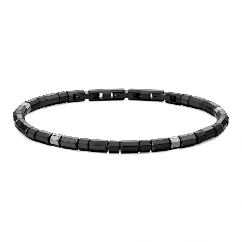 Tento štýlový náramok kombinuje moderný dizajn s odolnými materiálmi. Je vyrobený z chirurgickej ocele, ktorá je známa svojou silou, dlhou životnosťou a odolnosťou voči korózii. Povrch náramku je vybavený čiernym povlakom PVD, ktorý mu dodáva elegantný, matný lesklý vzhľad a zvyšuje jeho odpor na škrabance. Kvôli svojej dĺžke 22 cm sa pohodlne nosí na širšom zápästí. Návrh náramku je minimalistický a vyzerá veľmi mužne, bez zbytočnej dekorácie, s dôrazom na čisté línie a kvalitu spracovania.