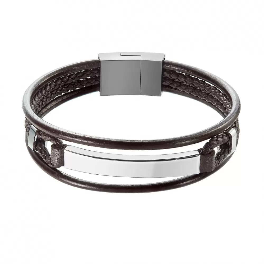 Pánsky náramok je vyrobený z rôzne tvarovaných pásikov z tmavo hnedej recyklovanej kože a koženky ozdobený oceľovým prvkom, ktorá upúta pozornosť okolia.