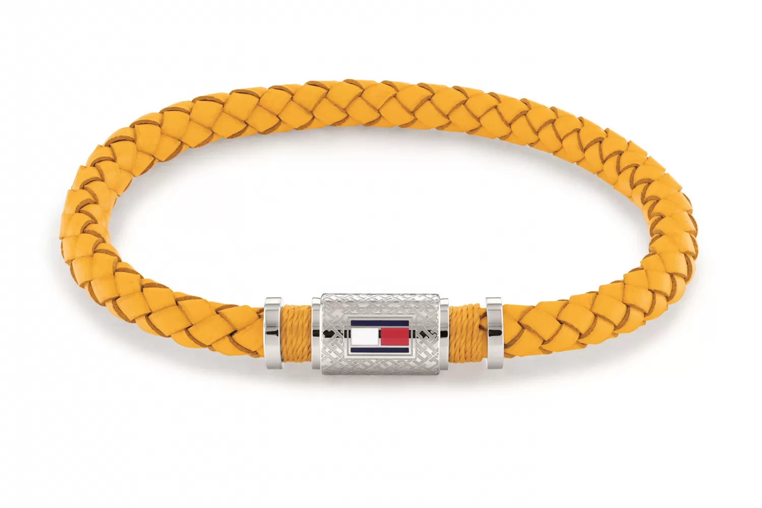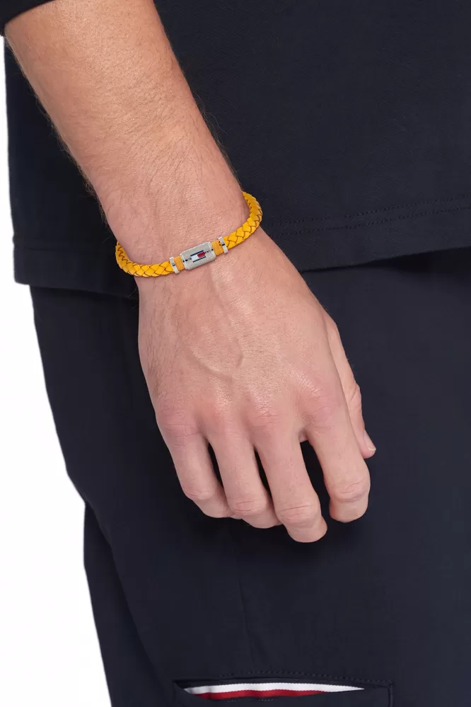 Moderný pánsky náramok tvorený zo žltej prepletenej koženej pásky a oceľového zapínania na magnet. Nechýba ani obľúbená tricolora značky Tommy Hilfiger. Tento náramok musíte mať.