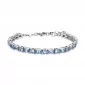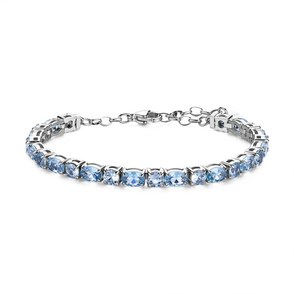 Tento náramok je luxusným doplnkom, ktorý spája moderný dizajn s jemným leskom kryštálov. Je vyrobený z kvalitnej nehrdzavejúcej ocele, ktorá zaručuje vysokú odolnosť a dlhotrvajúci lesk. Dominantným prvkom sú precízne vybrúsené kryštály v modrej farbe, ktoré pri dopade svetla vytvárajú jemnú hru odleskov a dodávajú kúsku sofistikovaný nádych. Každý kryštál je starostlivo zasadený do oceľového lôžka, čo zaručuje bezpečné uchytenie aj pri dlhodobom nosení. Tento model je ideálny pre ženy, ktoré milujú šperky s trblietkami, no zároveň si potrpia na decentný a vkusný štýl.