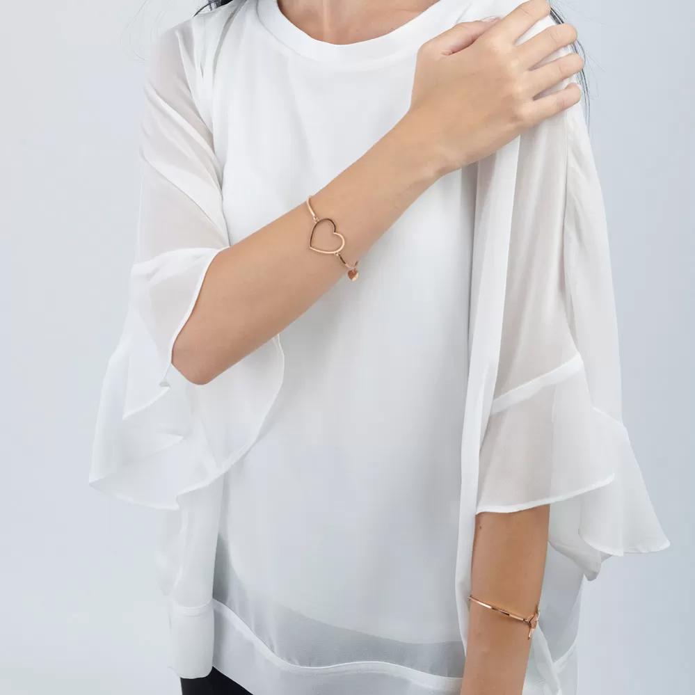 Vysoko elegantný šperk pre ženy je vyrobený z kvalitnej ušľachtilej ocele, ktorá je opatrená povrchovou úpravou vo farbe ružového zlata. Náramok zdobí veľké, neprehliadnuteľné srdce. Dĺžka náramku je 15 cm, s využitím retiazky 3 cm, je možné náramok zapnúť v dĺžke 15 až 18 cm. Nastaviteľná dĺžka má úžasnú výhodu v tom, že nemusíte poznať presnú dĺžku náramku a obdarovaná osoba si dĺžku sama upraví podľa vlastných preferencií. Náramok sa zapína na spoľahlivú karabínu.