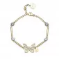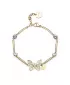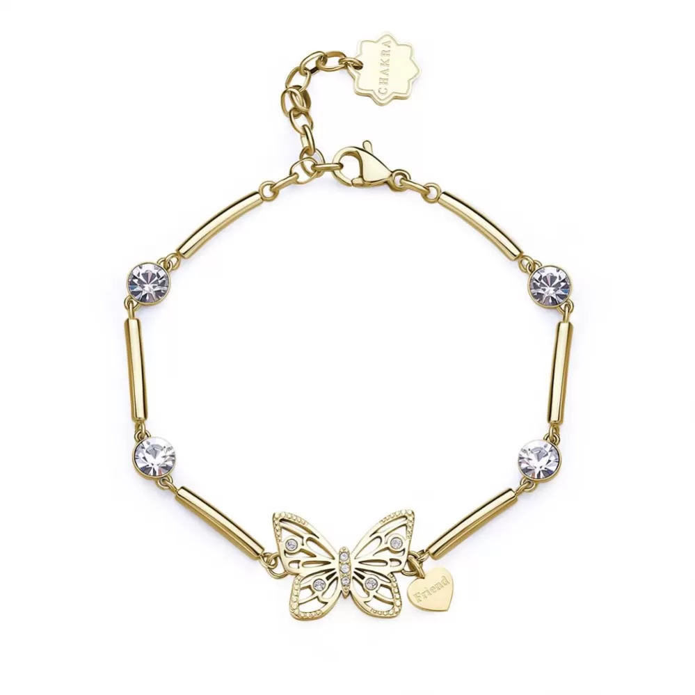 Roztomilý náramok je vyrobený z vysoko kvalitnej nerezovej ocele, ktorá je ošetrená PVD povrchovou úpravou vo farbe žltého zlata. Náramok je zdobený prepracovaným motýlikom a žiarivými Swarovski kryštálmi. Náramkom je vhodné obdarovať priateľku, ktorú určite poteší. Dĺžka náramku je 15 cm, s využitím retiazky 3 cm, je možné náramok zapnúť v dĺžke 15 až 18 cm. Nastaviteľná dĺžka má úžasnú výhodu v tom, že nemusíte poznať presnú dĺžku náramku a obdarovaná osoba si dĺžku sama upraví podľa vlastných preferencií.