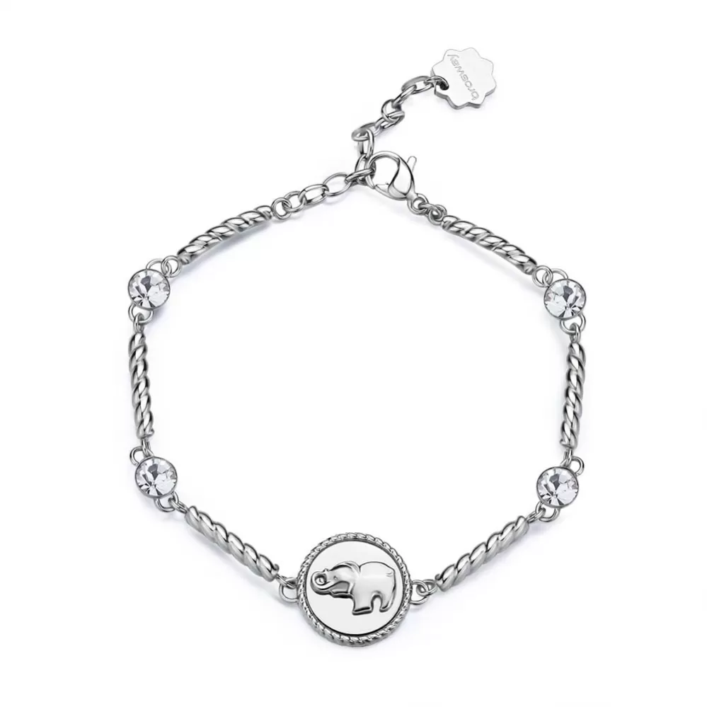 Darujte náramok pre šťastie a urobte radosť svojim blízkym. Náramok je vyrobený z vysoko kvalitnej nerezovej ocele, ktorú ocenia aj citliví jedinci. Náramok je zdobený príveskom v okrúhlom tvare so slonom pre šťastie. Nesmie chýbať trochu lesku. Ten zaistí prvotriedne Swarovski kryštály v okrúhlom tvare. Dĺžka náramku je 15 cm, s využitím retiazky 3 cm, je možné náramok zapnúť v dĺžke 15 až 18 cm. Nastaviteľná dĺžka má úžasnú výhodu v tom, že nemusíte poznať presnú dĺžku náramku a obdarovaná osoba si dĺžku sama upraví podľa vlastných preferencií. Náramok sa zapína na spoľahlivú karabínu.