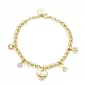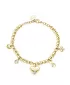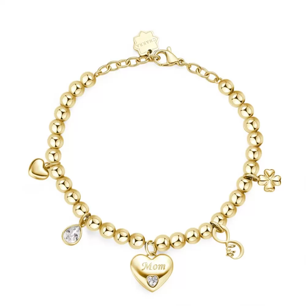 Ten najlepší darček čo môžete dať svojej mamičke. Darček zo srdca vo forme tohto náramku. Náramok je vyrobený z vysoko kvalitnej nerezovej ocele, ktorá je ošetrená PVD povrchovou úpravou vo farbe žltého zlata. Náramok je zdobený príveskami v tvare srdca, nekonečna, štvorlístka a kvapky. Prívesky sú vysadené Swarovski kryštálmi. Dĺžka náramku je 15 cm, s využitím retiazky 3 cm, je možné náramok zapnúť v dĺžke 15 až 18 cm. Nastaviteľná dĺžka má úžasnú výhodu v tom, že nemusíte poznať presnú dĺžku náramku a obdarovaná osoba si dĺžku sama upraví podľa vlastných preferencií.