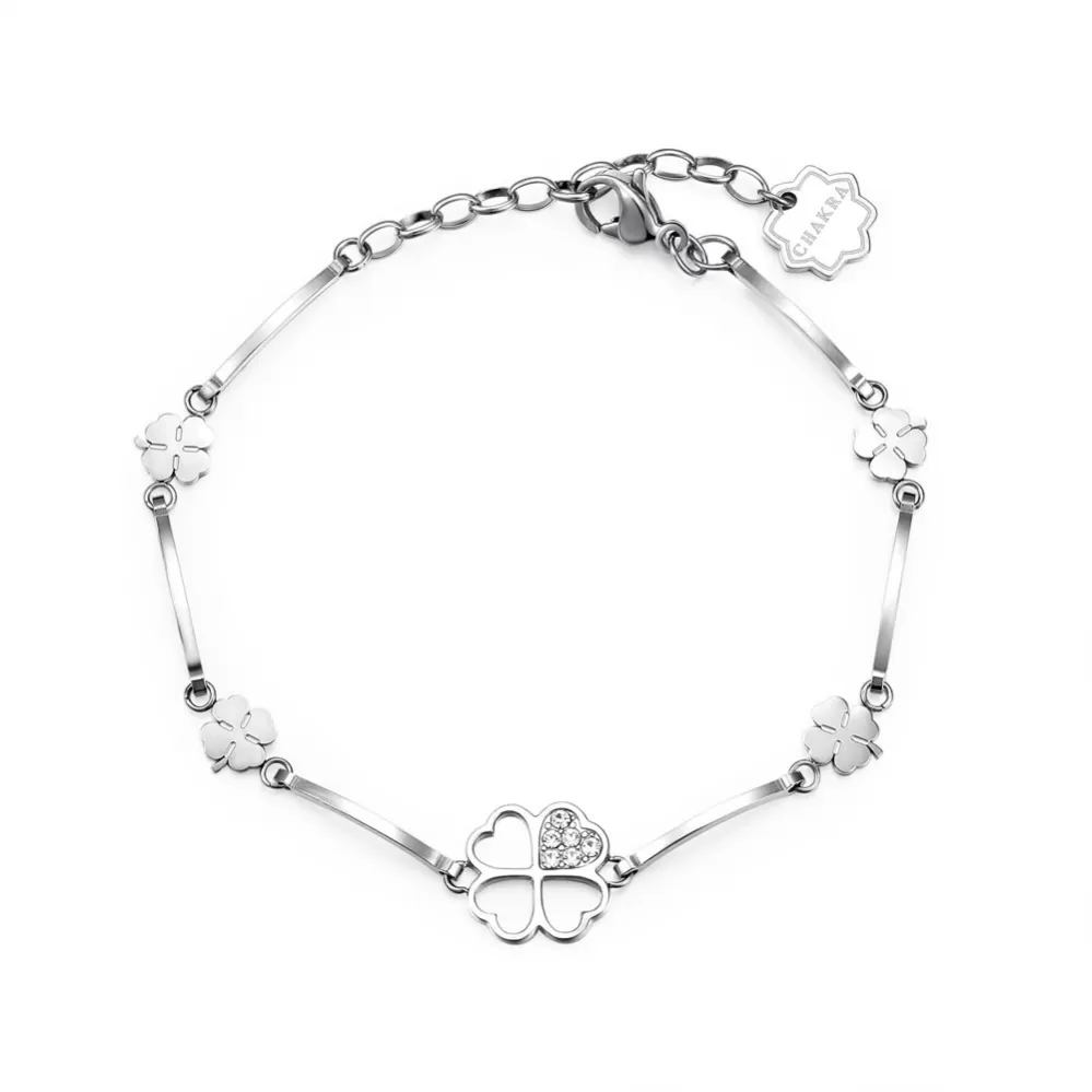 Nádherný a vysoko elegantný náramok pre ženy je vyrobený z ušľachtilej ocele, ktorá je v lesklej povrchovej úprave. Náramok zdobí štvorlístok a kryštály Swarovski. Dĺžka náramku je 15 cm, s využitím retiazky 3 cm, je možné náramok zapnúť v dĺžke 15 až 18 cm. Nastaviteľná dĺžka má úžasnú výhodu v tom, že nemusíte poznať presnú dĺžku náramku a obdarovaná osoba si dĺžku sama upraví podľa vlastných preferencií. Náramok sa zapína na spoľahlivú karabínu.