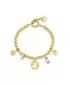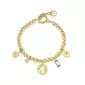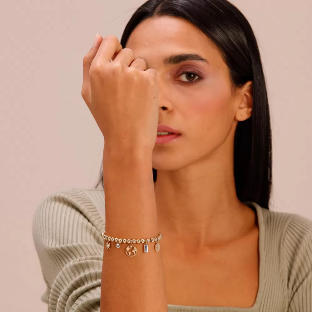 Nenapodobiteľný štýl tohto náramku Vás dostane. Náramok je vyrobený z vysoko kvalitnej chirurgickej ocele vo farbe žltého zlata. Náramok zdobí okrúhly prívesok dekorovaný kontinentmi a hviezdičkami. Ďalej náramok zdobia Swarovski kryštály. Dĺžka náramku je 15 cm, s využitím retiazky 3 cm, je možné náramok zapnúť v dĺžke 15 až 18 cm. Nastaviteľná dĺžka má úžasnú výhodu v tom, že nemusíte poznať presnú dĺžku náramku a obdarovaná osoba si dĺžku sama upraví podľa vlastných preferencií.