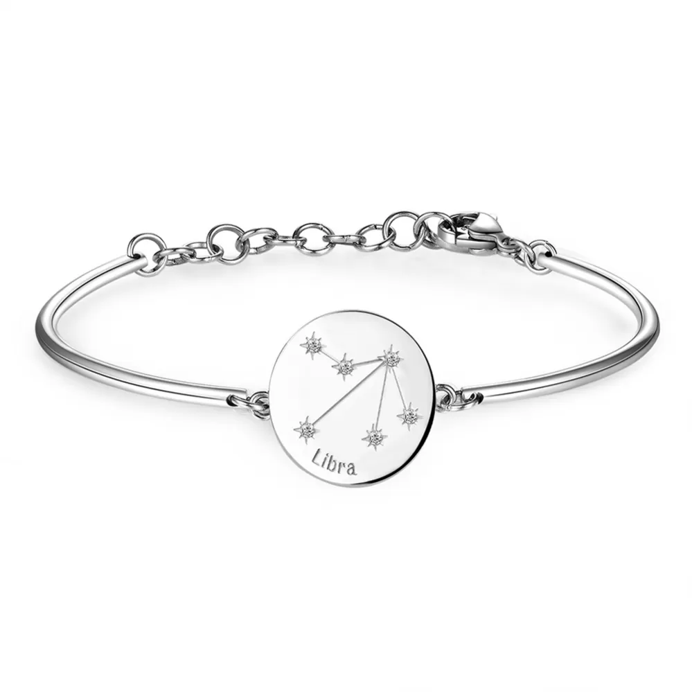 Dámsky náramok s pevnou konštrukciou dokonale padne na každé zápästie. Náramok zdobí okrúhly prívesok so znamením zverokruhu váh. Prívesok je zdobený kryštálmi Swarovski. Dĺžka náramku je 15 cm, s využitím retiazky 3 cm, je možné náramok zapnúť v dĺžke 15 až 18 cm. Nastaviteľná dĺžka má úžasnú výhodu v tom, že nemusíte poznať presnú dĺžku náramku a obdarovaná osoba si dĺžku sama upraví podľa vlastných preferencií. Náramok sa zapína na spoľahlivú karabínu.