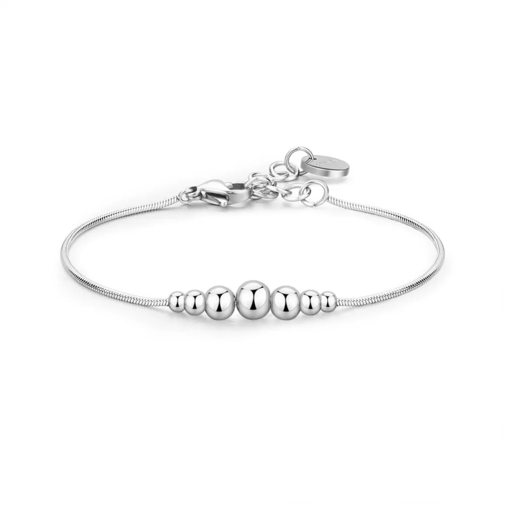 Žiarivý dámsky náramok je vyrobený z vysoko kvalitnej nerezovej ocele, ktorú ocenia aj citliví jedinci. Náramok zdobia guličky vo vysokom lesku. Dĺžka náramku je 15 cm, s využitím retiazky 5 cm, je možné náramok zapnúť v dĺžke 15 až 20 cm. Nastaviteľná dĺžka má úžasnú výhodu v tom, že nemusíte poznať presnú dĺžku náramku a obdarovaná osoba si dĺžku sama upraví podľa vlastných preferencií. Náramok sa zapína na spoľahlivú karabínu.
